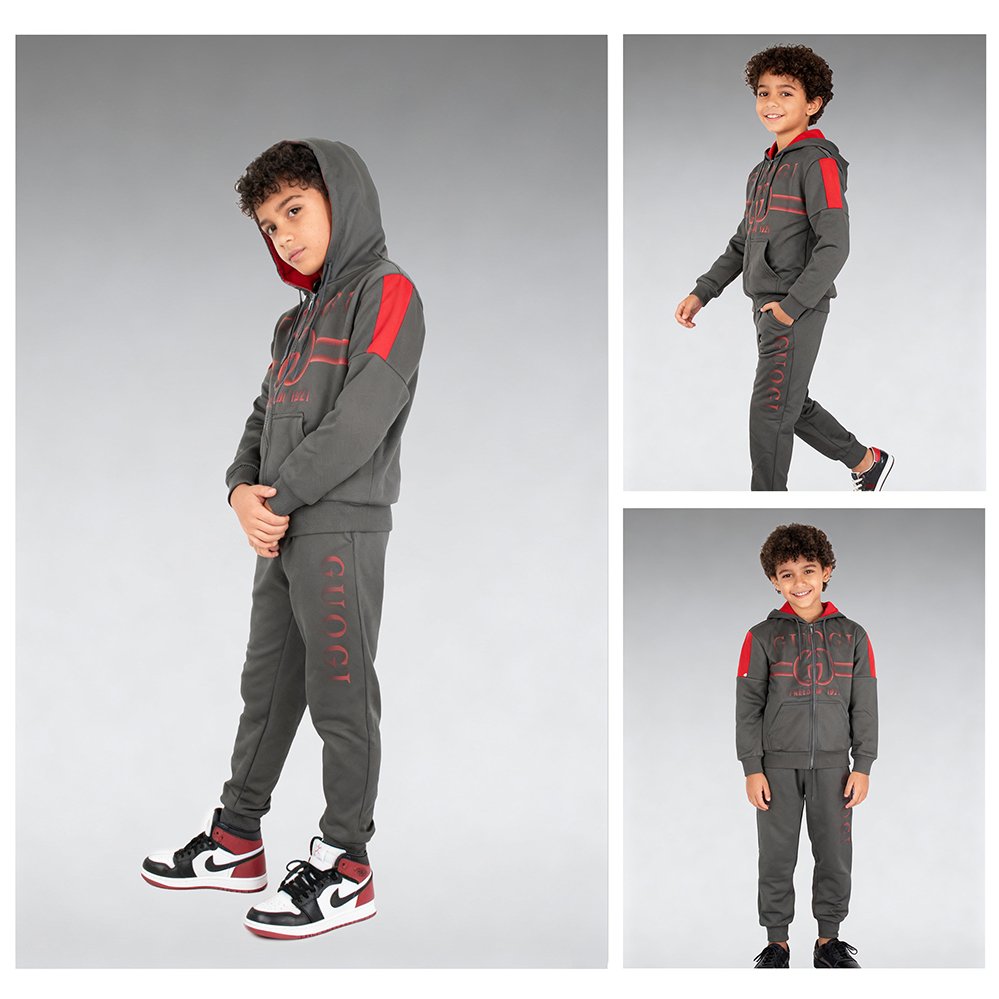 The sweatshirt features a full front zip-up for easy on and off, making it very child-friendly. The hood with an adjustable drawstring adds warmth and enhances the overall style. The pants have a classic jogger fit, with a tapered leg to prevent dragging on the ground, ensuring safety and a neater look. Practical cargo pockets on the sides not only add visual appeal but also enhance storage functionality, aligning with the current international trend of “functional casual wear” in children’s clothing.