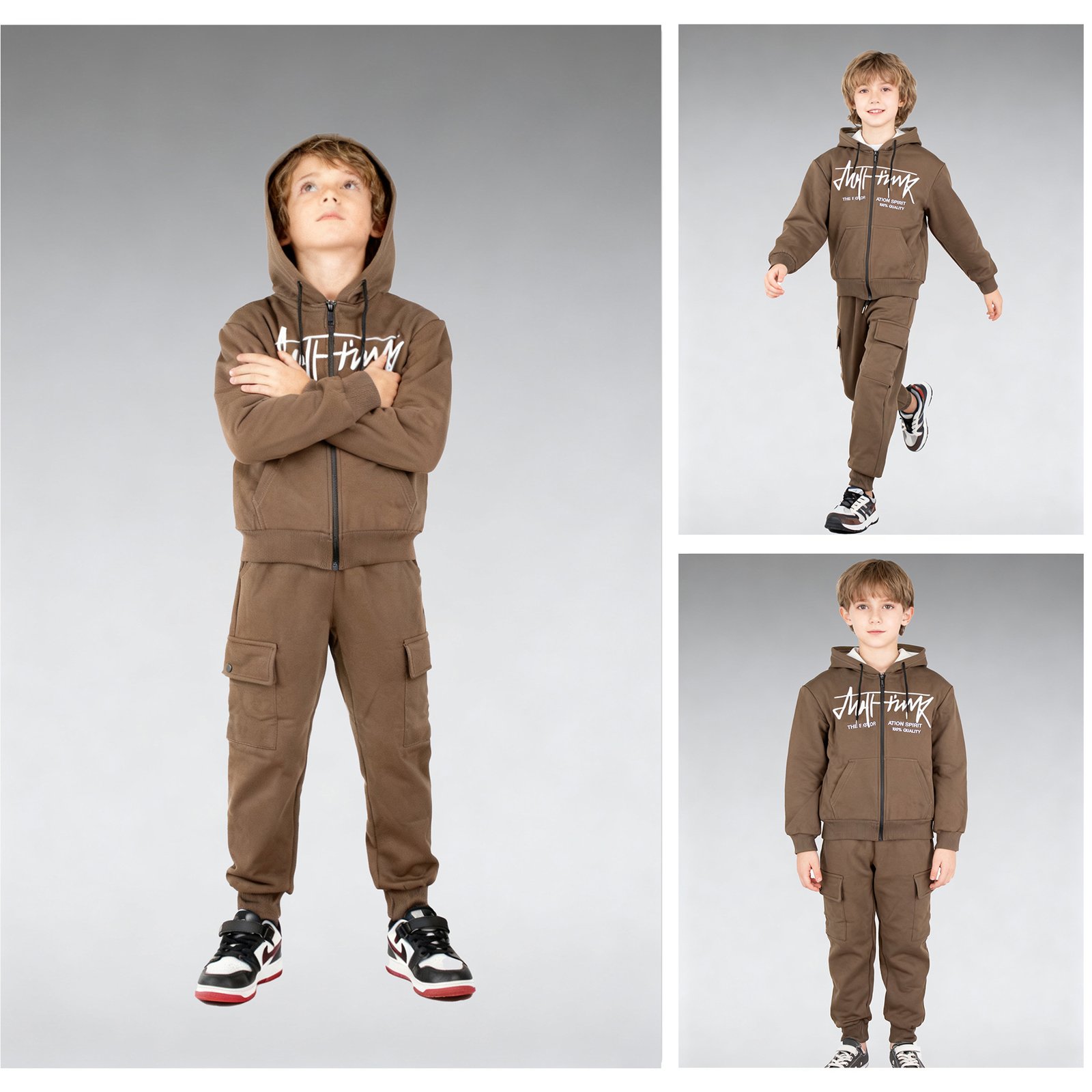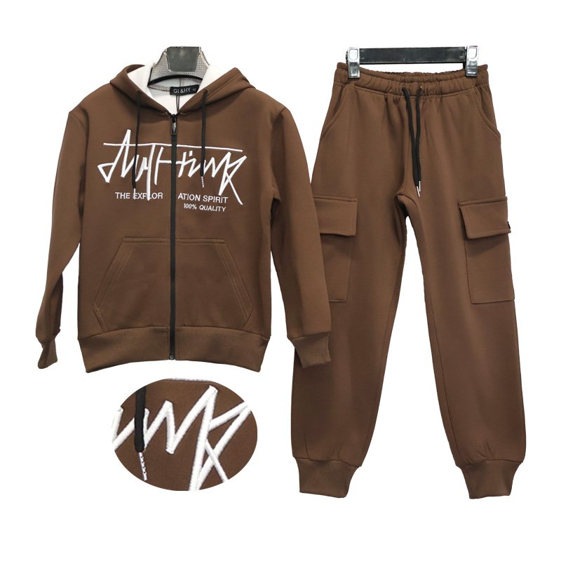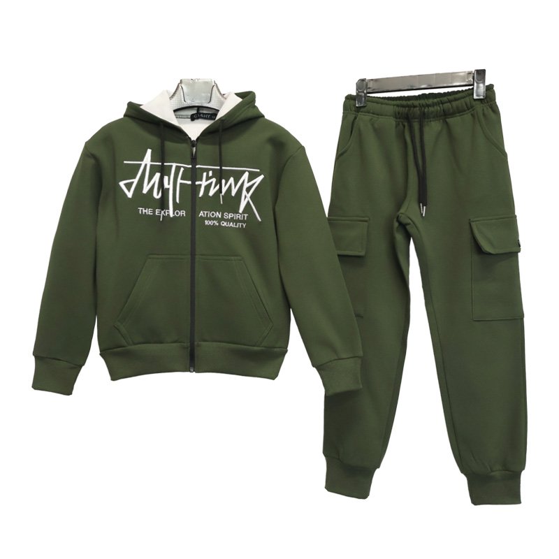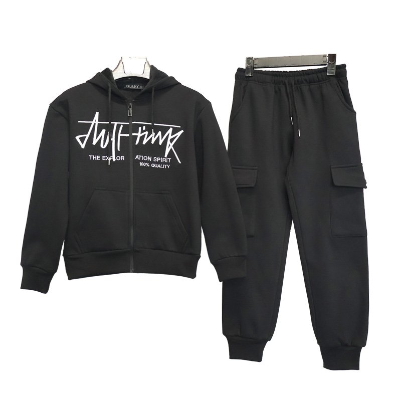 This is a two-piece set consisting of a hooded zip-up sweatshirt and jogger cargo sweatpants. The overall design uses a unified color scheme, resulting in a simple yet stylish look that aligns with the current mainstream market trend of “casual streetwear.”